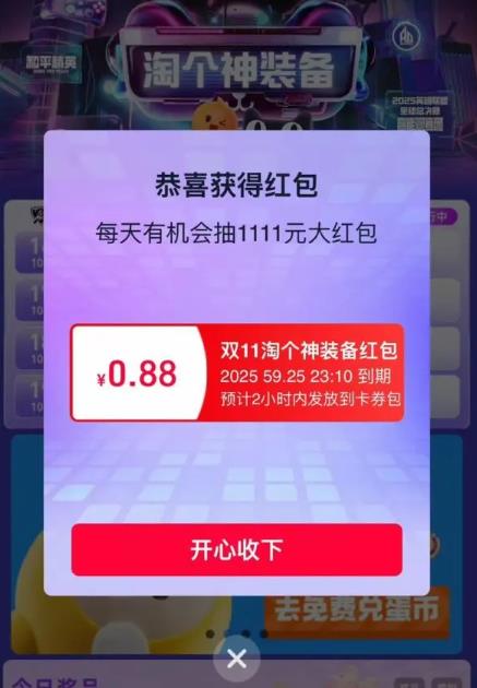 淘宝 电竞购物清单 每日进入弹窗抽奖可赢至高1111元随机红包 实测0.88元(每日可抽)